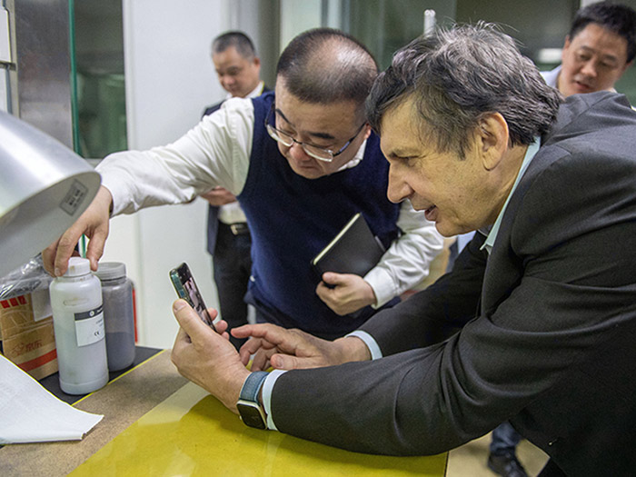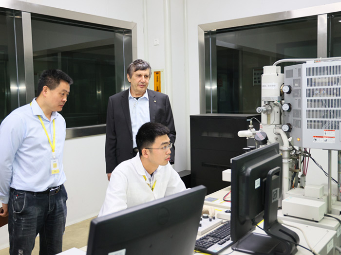 在科技中心,安德烈?海姆教授饒有興趣地參觀了超威科技項目研發(fā)實驗室。當(dāng)看到石墨烯項目組研發(fā)人員正在進行材料分析時,他饒有興趣地拿起一瓶石墨烯材料仔細觀察,并與研發(fā)人員進行相關(guān)技術(shù)問題。